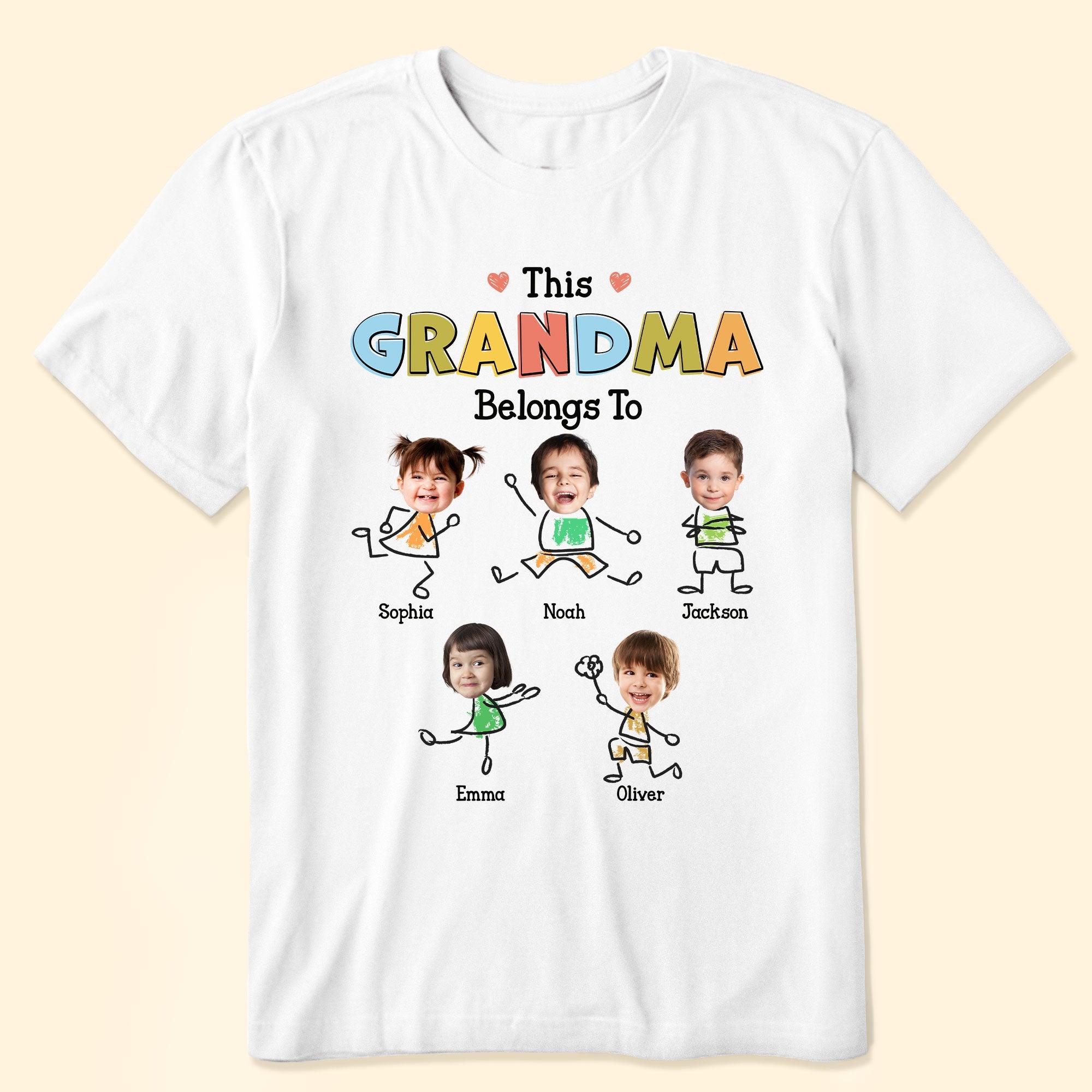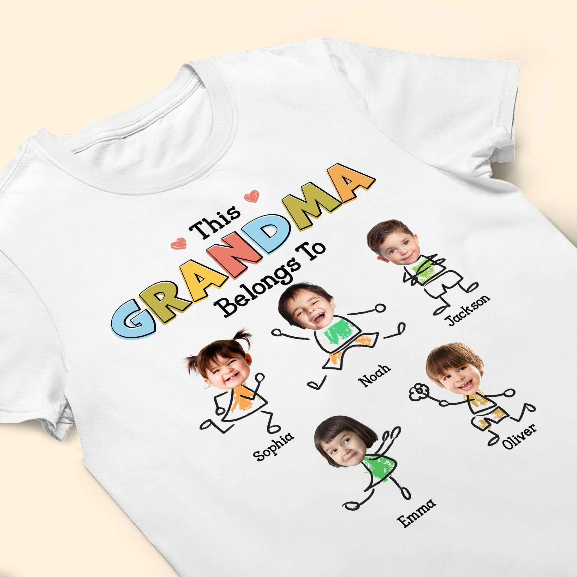 Embrace the joy of being a grandma with this adorable ‘This Grandma Belongs To’ t-shirt! Each playful stick figure represents a beloved grandchild, personalized with their name right beneath. This heartwarming shirt celebrates the unique bond between grandma and her little ones. With colorful letters that pop and sweet little hearts, it’s the perfect gift for any grandma who wears her title with pride. Whether she’s out on a family day or just relaxing at home, this shirt is sure to be a conversation starter and a treasure she’ll love to wear.”